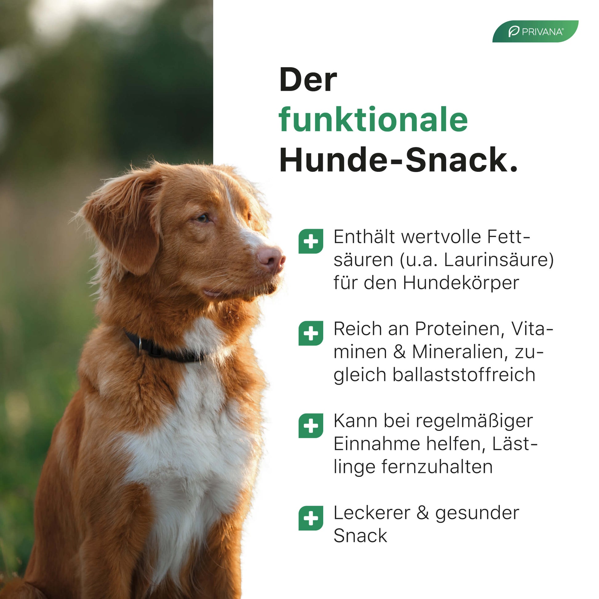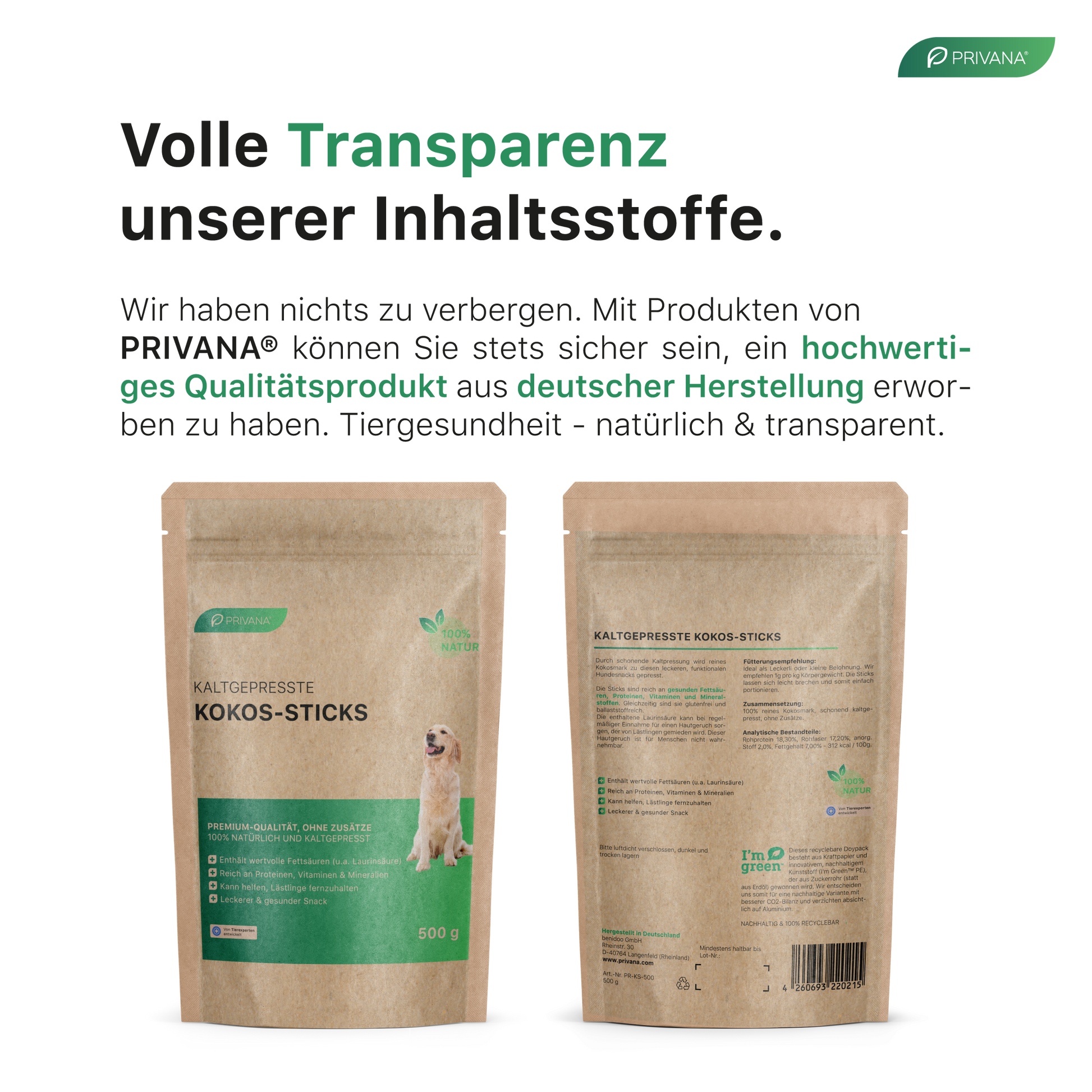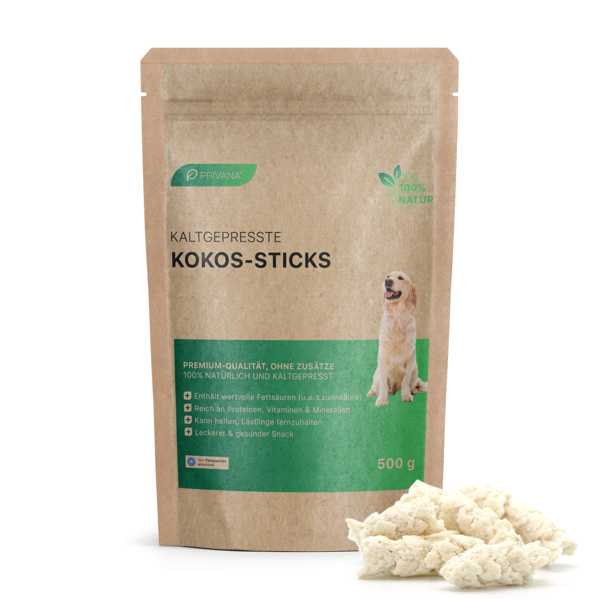 Die natürlichen Kokos-Sticks von PRIVANA bestehen zu 100% aus reinem Kokosmark und enthalten keine Zusatzstoffe. Durch schonende Kaltpressung wird das Kokosmark zu diesem leckeren, funktionalen Hundesnack gepresst. Die Sticks sind reich an gesunden Fettsäuren (u.a. Laurinsäure), Proteinen, Vitaminen und Mineralstoffen. Gleichzeitig sind sie glutenfrei, ballaststoffreich und kohlenhydratarm.