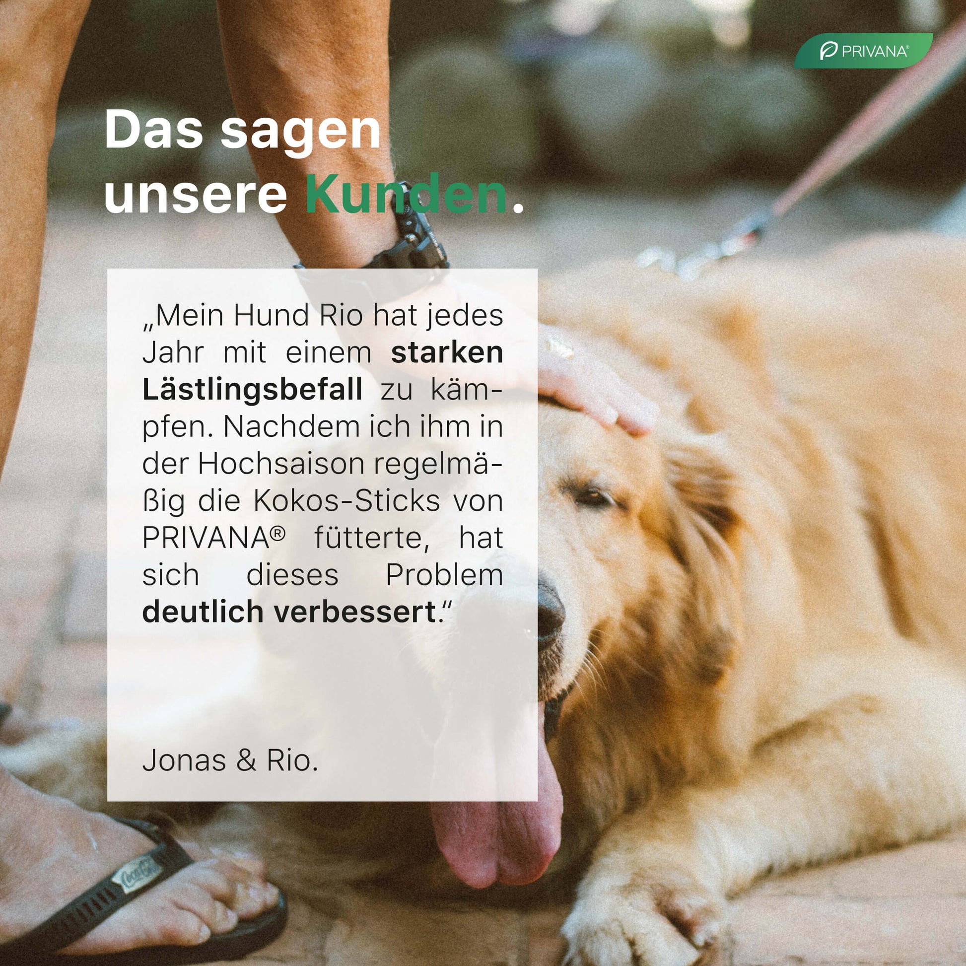Wir empfehlen die Kokos-Sticks inbesondere während der Zeckensaison. Sie können ideal als Leckerli gereicht werden.